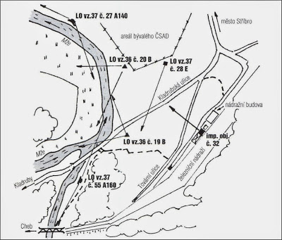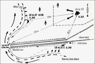 Vlevo - Náčrt umístění improvizované objektu č. 32 v budově nádražního skladiště a jeho zakomponování do palebných úseků ostatních objektů LO.