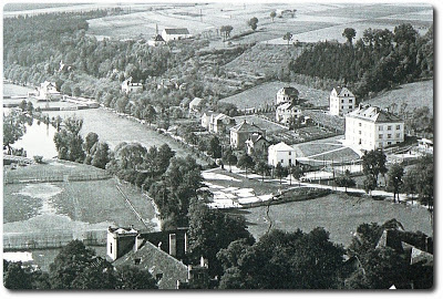 Vpravo - Kladrubská ulice v úseku pod nádražím. Osamocená budova na horizontu je vila továrníka Justa, uvažovaná jako improvizovaný objekt č.33, mající chránit, na pohlednici též patrný, železniční most