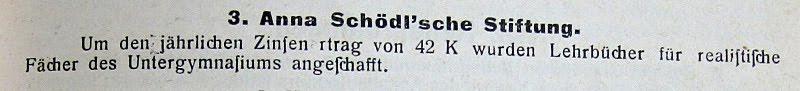 Anna Schödl byla v 19. století občankou města Stříbra (bydlela na stříbrském náměstí v domě čp. 7). Město po ní pojmenovalo uličku, jež se dnes zove "Na Výsluní". Neprovdaná Anna Schödl dostala od města tuto poctu, protože přispívala četnými dary kostelu, školám a také se zvlášť věnovala chudým ve městě. Už v roce 1859 nechala restaurovat tzv. "Boží hrob" a také později v závěti z 22.1.1868 určila, že roční obnos výnosu má sloužit na jeho údržbu. Též darovala sumu na vystavění zdi kostelního dvora. Dne 15.10.1860 udělila dvě stipendia pro dva pilné studenty ze Stříbra bez prostředků. Pro stříbrskou dívčí školu odkázala kapitál s podmínkou, že každý rok budou vzdělávána chudá děvčata v domácím hospodaření. Také reálná škola dostala obnos, aby každý rok byly zakoupeny učebnice pro chudé školáky. Všimla si, že mnoho školáků z chudších poměrů má špatné, nebo žádné boty a zaplatila práci ševcům, aby i tyto děti mohly chodit do školy v botách. Stříbrskému kostelu darovala roku 1862 postranní oltář bolestivé matky boží a cenný koberec pro schody k hlavnímu oltáři. Ještě v roce 1920 (a zřejmě i později) fungovala ve městě nadace nesoucí její jméno - viz zápis v ročence místního gymnázia o nákupu učebnic z prostředků nadace (viz obr).