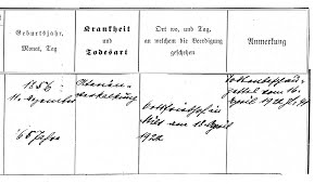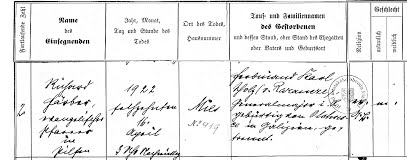 | Podle matričního zápisu v Knize zemřelých byl pohřbívajícím duchovním Richard Färber, evangelický farář v Plzní. Dotyčný Ferdinand Scholz zemřel 16. dubna 1922 ve 3 hod. odpoledne, byl vdovec, příčinou smrti bylo kornatění tepen. Pohřben byl 18.4.1922 na městském hřbitově ve Stříbře. Podle poznámky byl Ohledací lístek č. 41 vystaven 16. dubna 1922