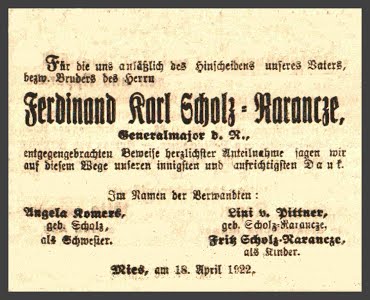 16.04.1922 na neděli velikonoční zemřel po těžké nemoci pan generálmajor ve výslužbě Ferdinand Karl Scholz-Rarancze. Okresní hejtman Hans Strziska daroval 30 K na věnec pro zesnulého.