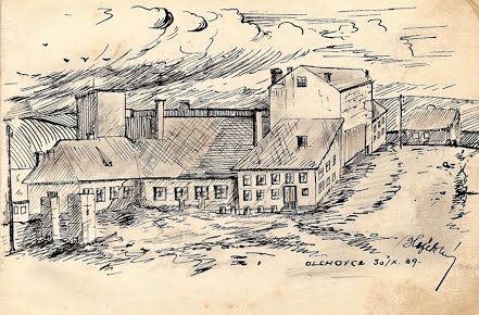 Olchovce (rodiště F. Sch.) na obrázku který namaloval 3.10.1939 jeden z příslušníku Čs. legionu, který pod velením pplk. Svobody procházel přes vesnici v říjnu 1939 při ústupu z Polska.