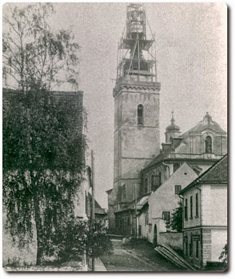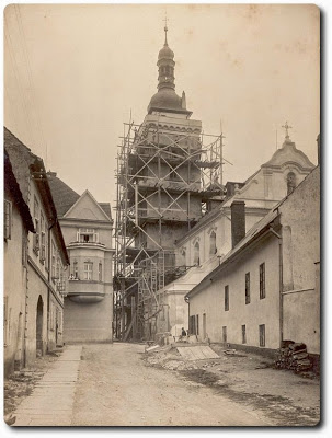 Znovu snímek, údajně pořízený u příležitosti již zmiňované operace „Zavěšení zvonů provedení“. Tentokrát však náš pohled směřuje na kostel od východu. Výše uvedené pochybnosti vyplývají z nepřehlédnutelných příznaků stavební činnosti, a to jak na lešení samém, tak u paty kostelní věže. Navíc pak i mohutnost a celková dispozice lešení…? Vyjádření osoby obeznámené s problematikou instalace zvonů ve věžích zní: K vyzdvižení a zavěšení zvonů většinou postačují poměrně jednoduché a tedy i levné technické prostředky. Kladky, patřičně uzpůsobená konzola a několik znalých a šikovných dělníků, neboli „fachmanů“. Pročež…bližší určení tohoto i předešlého podobného dokumentu necháme prozatím neuzavřeno. Zářivá běloba kostelní věže na pozadí blankytně modré oblohy pak přibližuje atmosféru osmého květnového dopoledne v roce 2006.