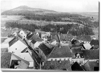 Vděčným stanovištěm fotografů bývají výškové stavby – příkladně kostelní věže. Tak tomu bylo i v případě obou zde prezentovaných snímků. Tentokrát míří objektivy fotoaparátů směrem východním, tedy podél ulice Kostelní. Porovnáním obou fotografií zjistíme, že třeba zcela chybí dvouposchoďový dům čp.840… a při troše námahy dokonce nalezneme dvojštít čp.54. Nebo, že nárožní čp.67 sice existuje, ale výškově ochuzeno o druhé patro. A právě posledně uvedená skutečnost nám dovolí určit alespoň horní časovou hranici pořízení tohoto záběru. Čp 67 bylo totiž pro potřeby v něm sídlící záložny adaptováno (a při tom i zvýšeno o další poschodí) v roce 1927. Foto z 15. července 2007 již některé „chyby“ předchozího snímku napravuje.