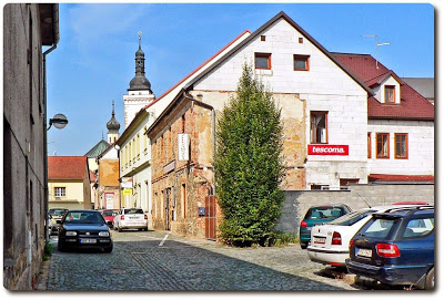 Již při procházce ulicí Plzeňskou jsme komentovali vznik parkoviště naproti lékárně Melissa. To vzniklo na místě zbořeného domu čp.54. Jeho podobu v pohledu z ulice kostelní máme zachycenu na snímku cca z poloviny 50. let (20.stol.). Oproti tomu 4.října roku 2008, ač zataženo, vyhlížela stejná místa o poznání přívětivěji. Touto dvojicí snímků jsme téměř uzavřeli naší procházku ulicí Kostelní, neboť čelně viděné barevné štíty již patří domům, jejichž adresní ulicí je ulice Plzeňská.
